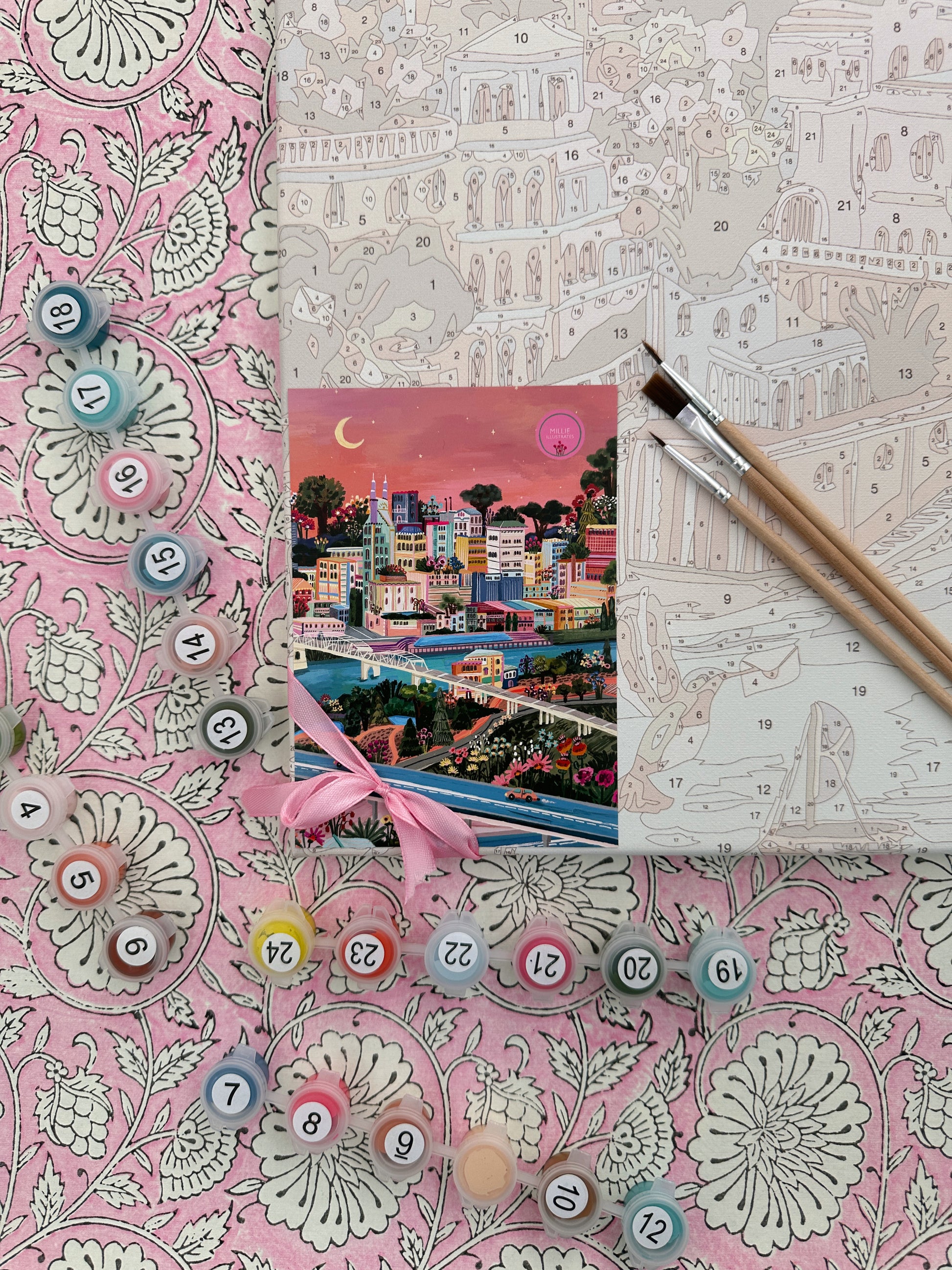 Each kit includes a numbered (hardback) boarded printed canvas, a set of 3 different sized brushes and lots of little pots of acrylic paint in gorgeous colours to match your chosen print.