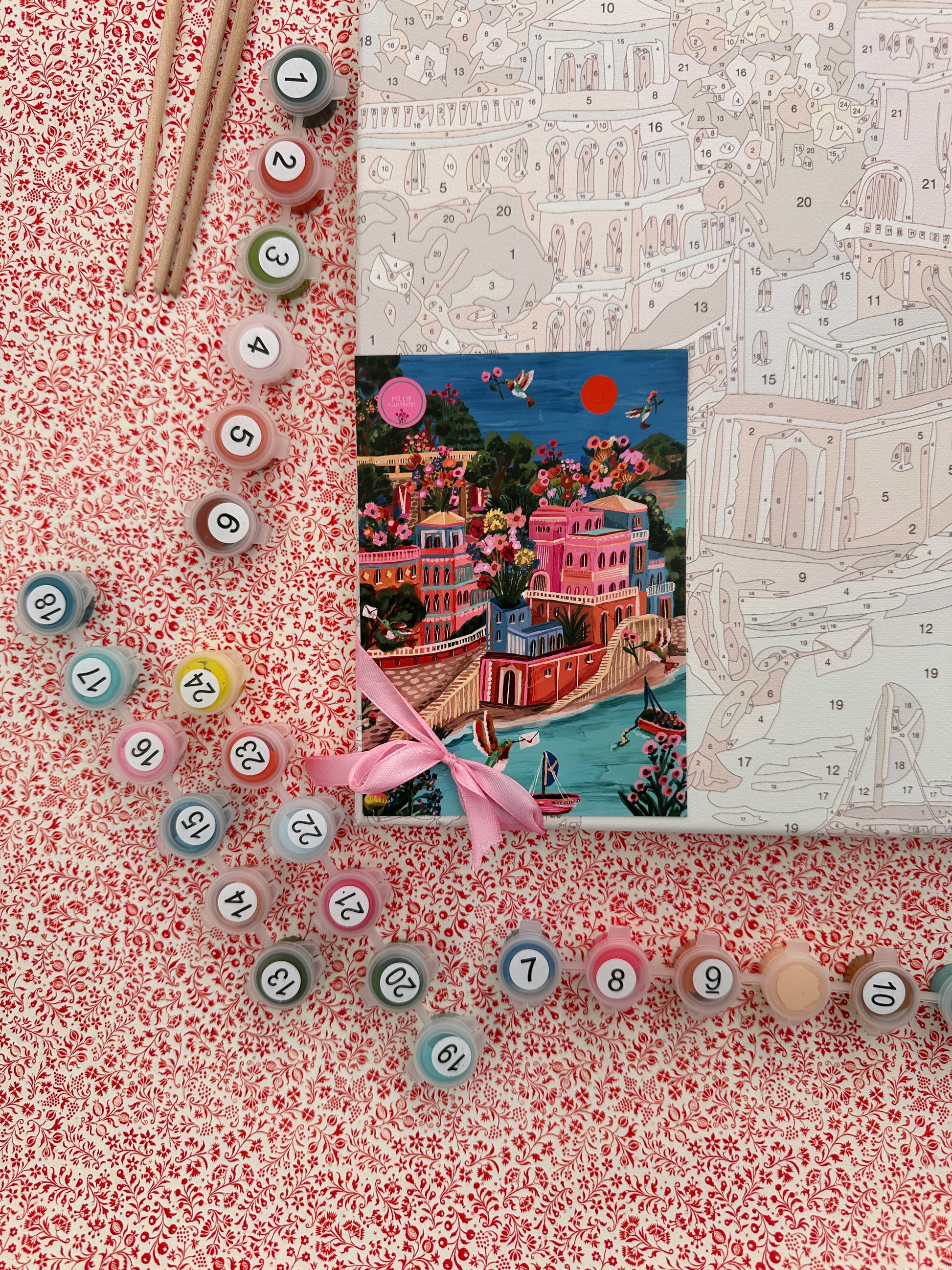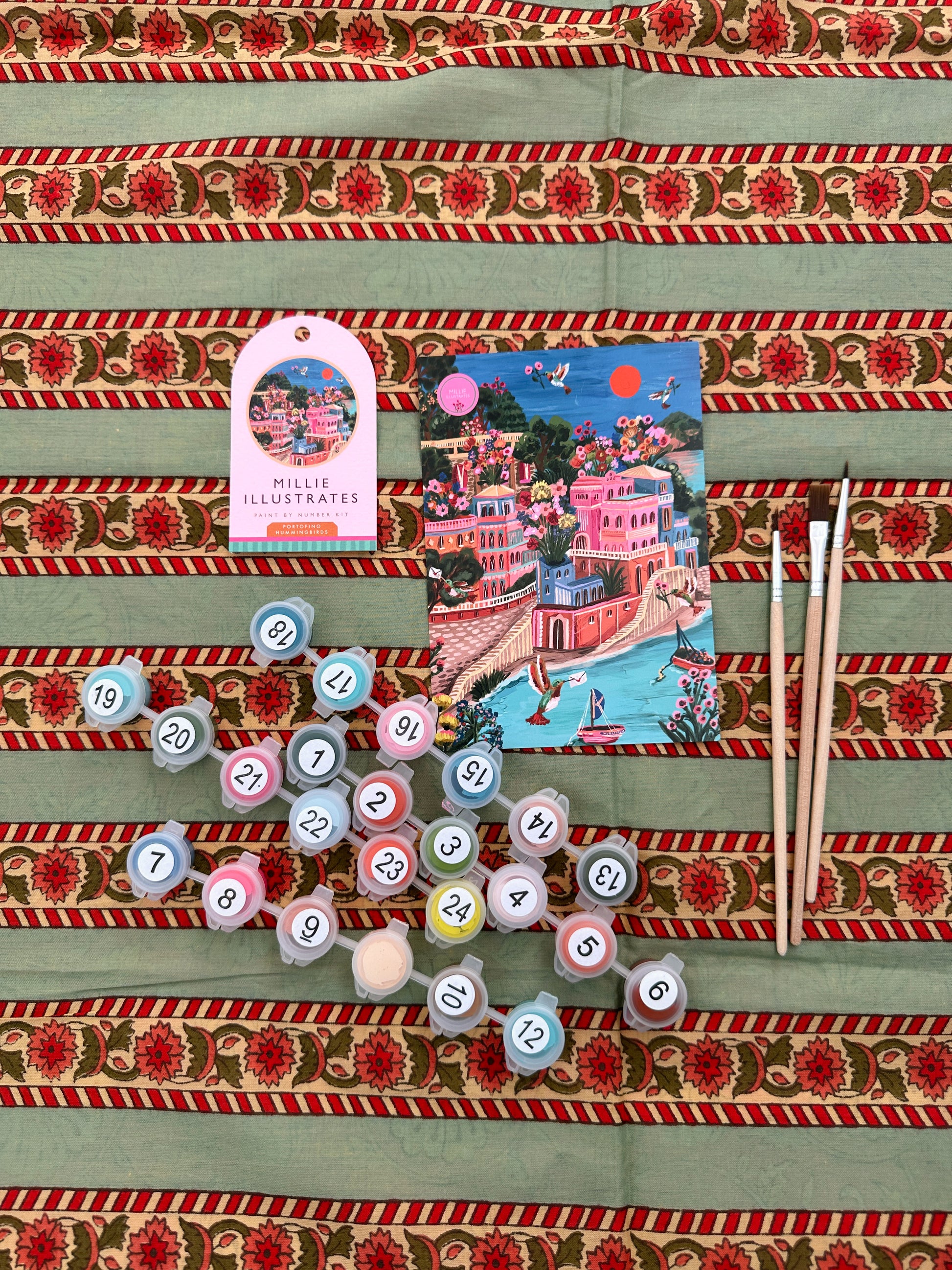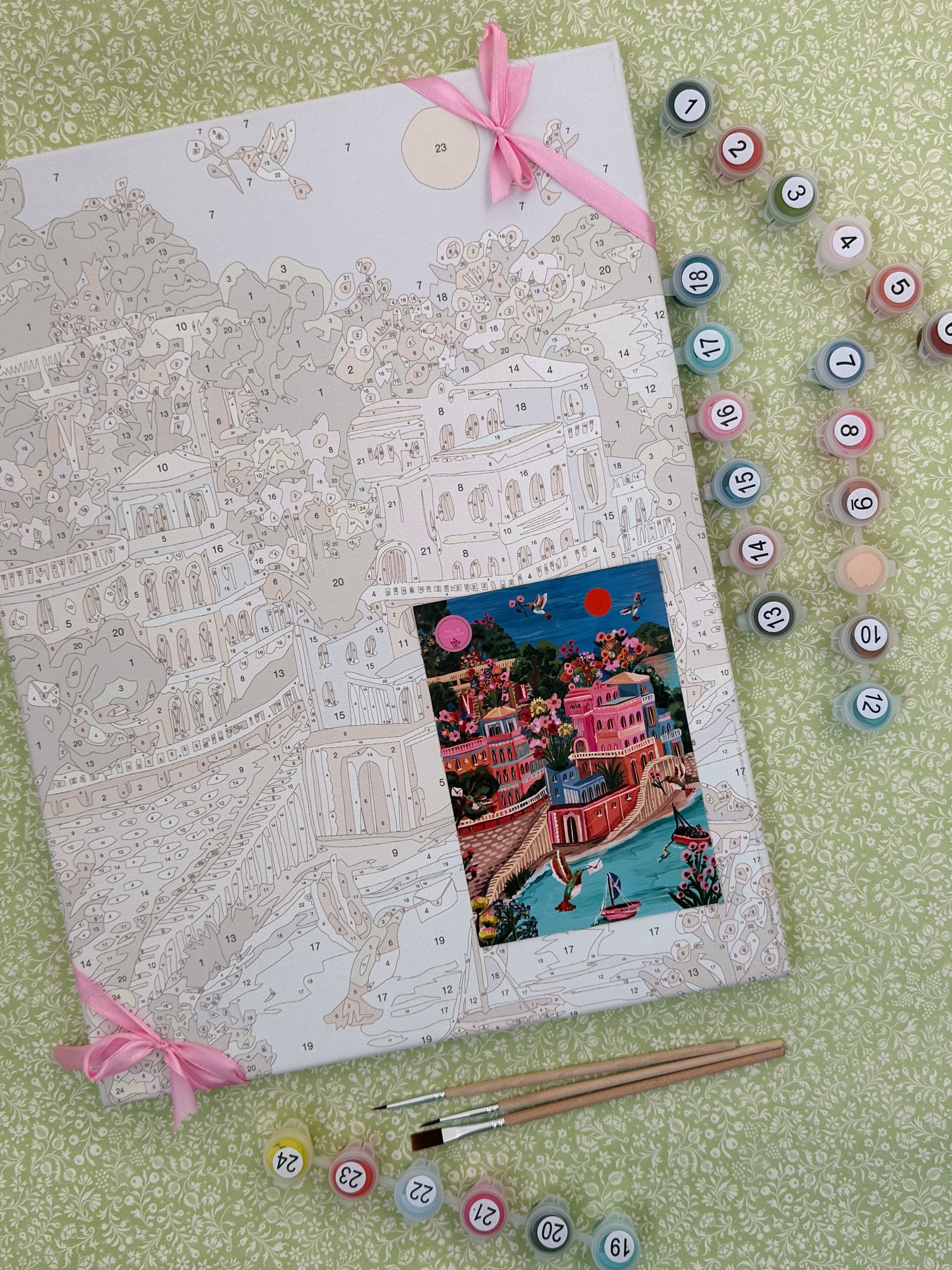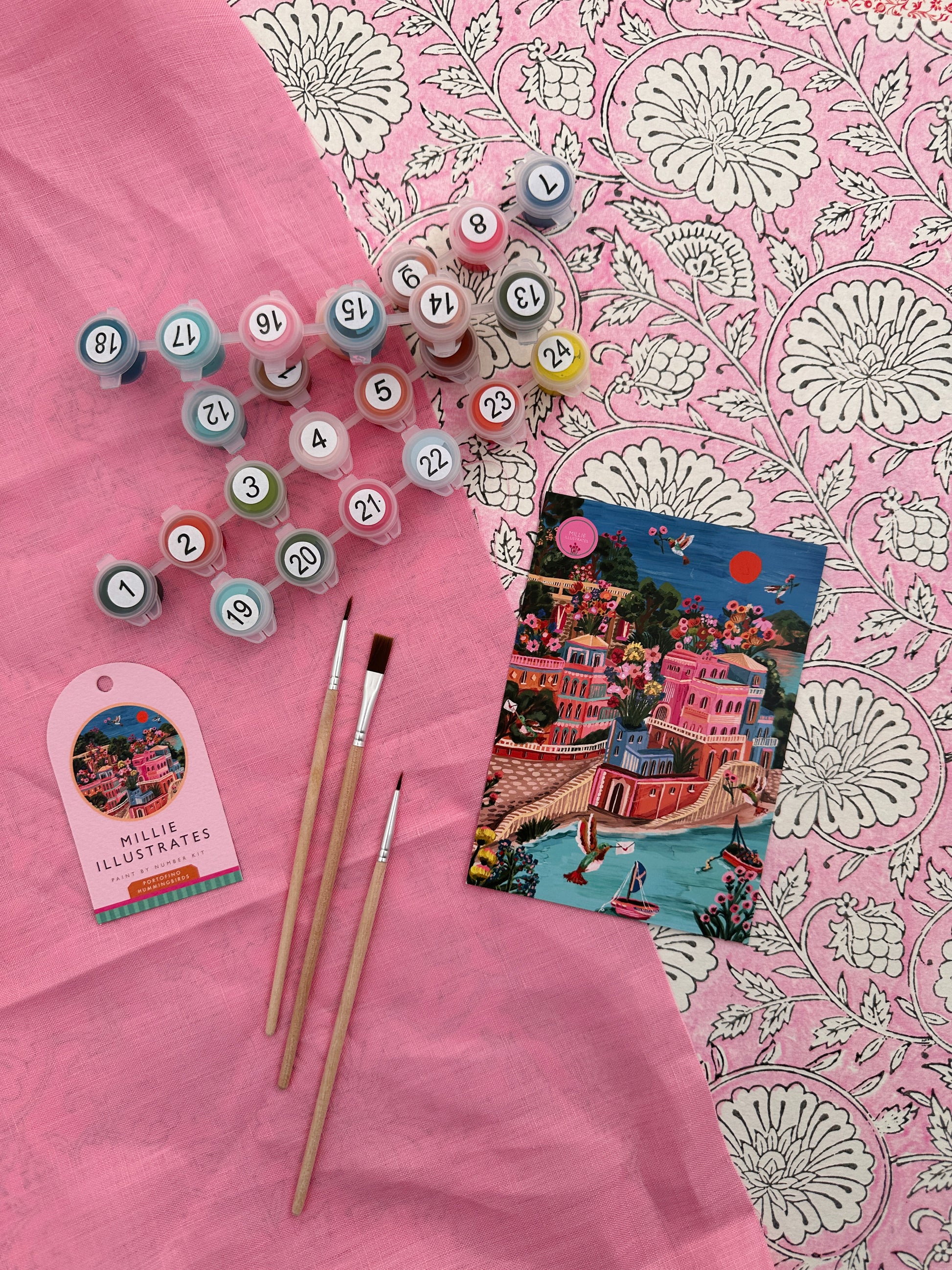 Each kit includes a numbered (hardback) boarded printed canvas, a set of 3 different sized brushes and lots of little pots of acrylic paint in gorgeous colours to match your chosen print.