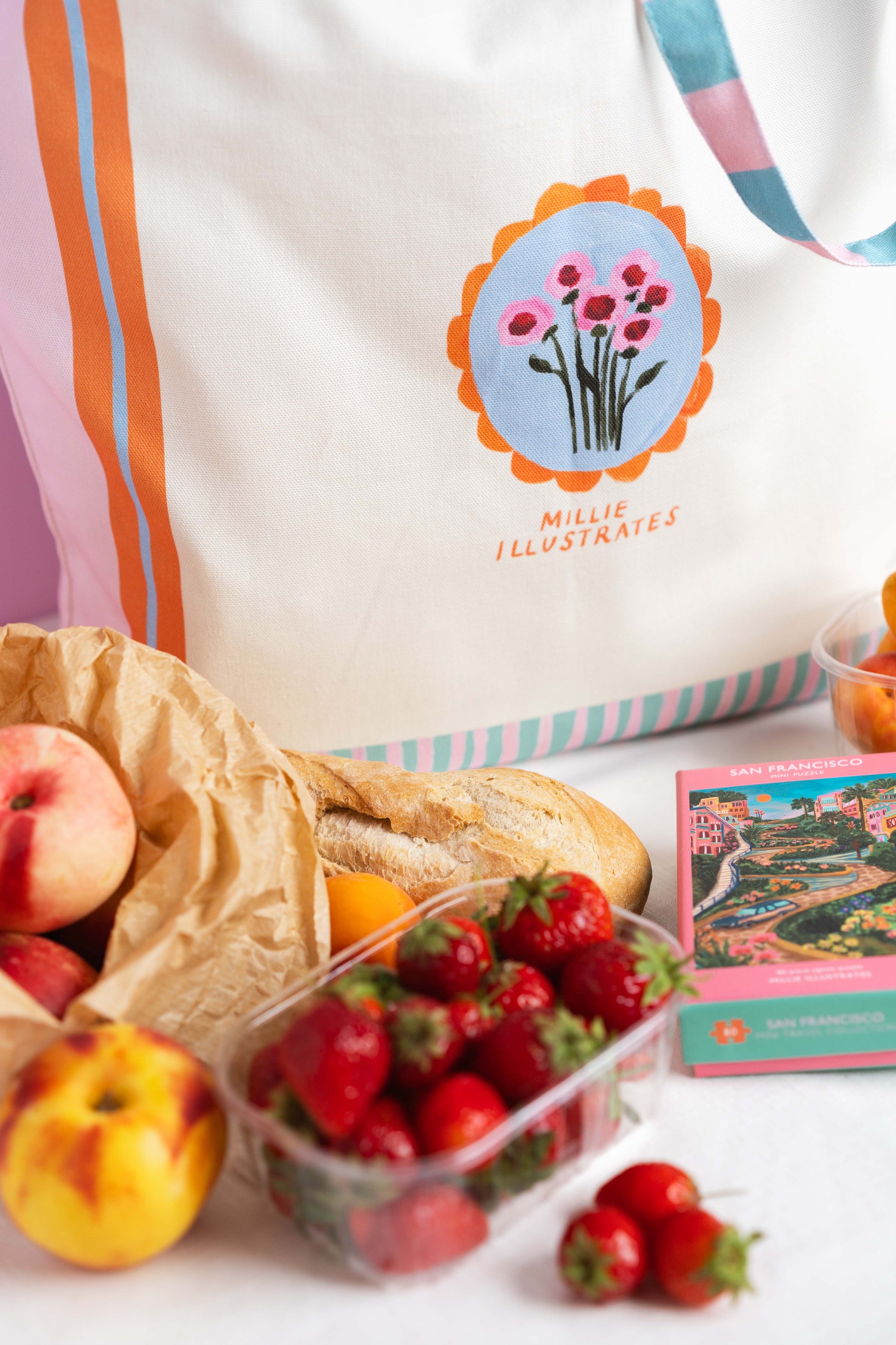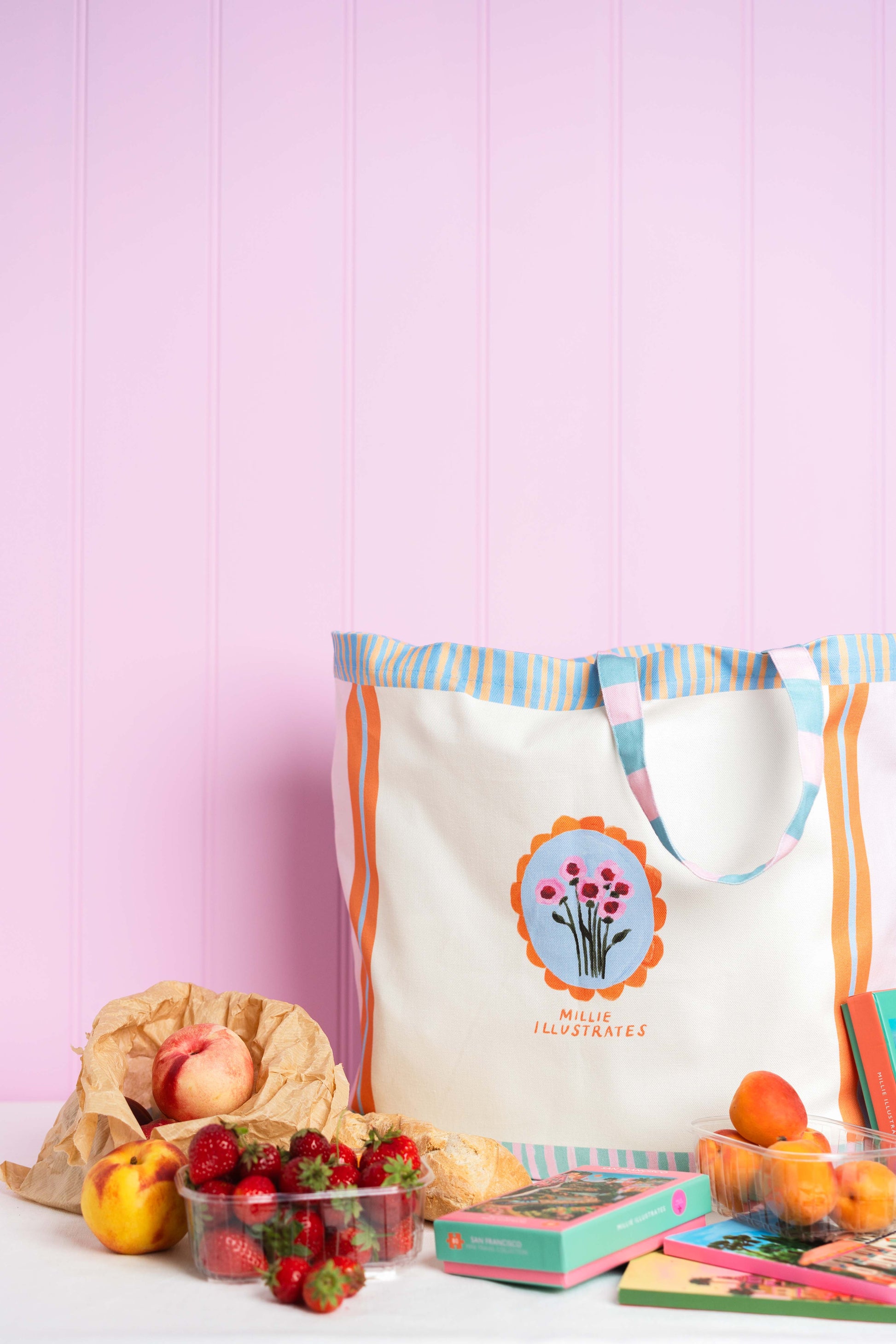 Millie illustrates logo on back of tote