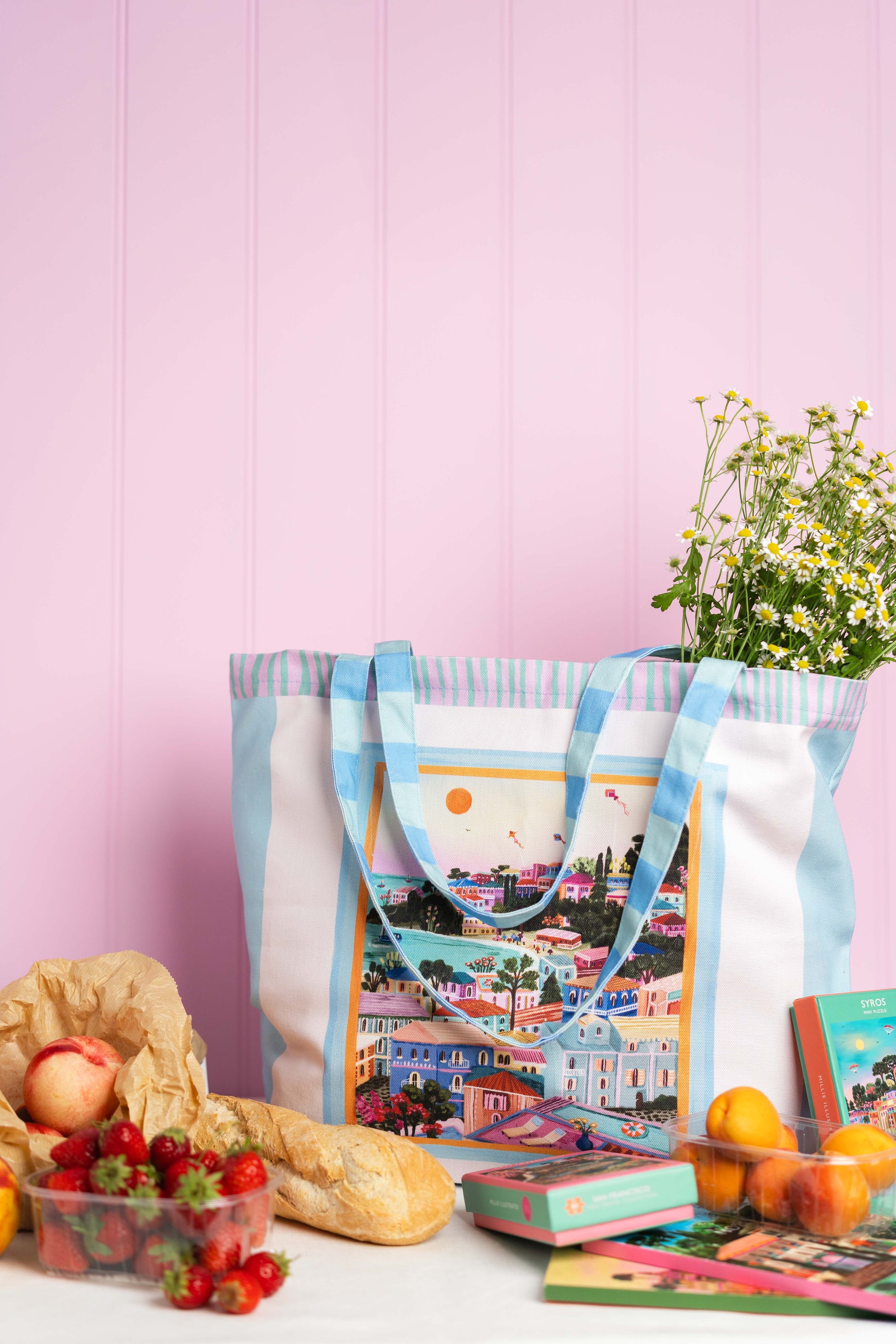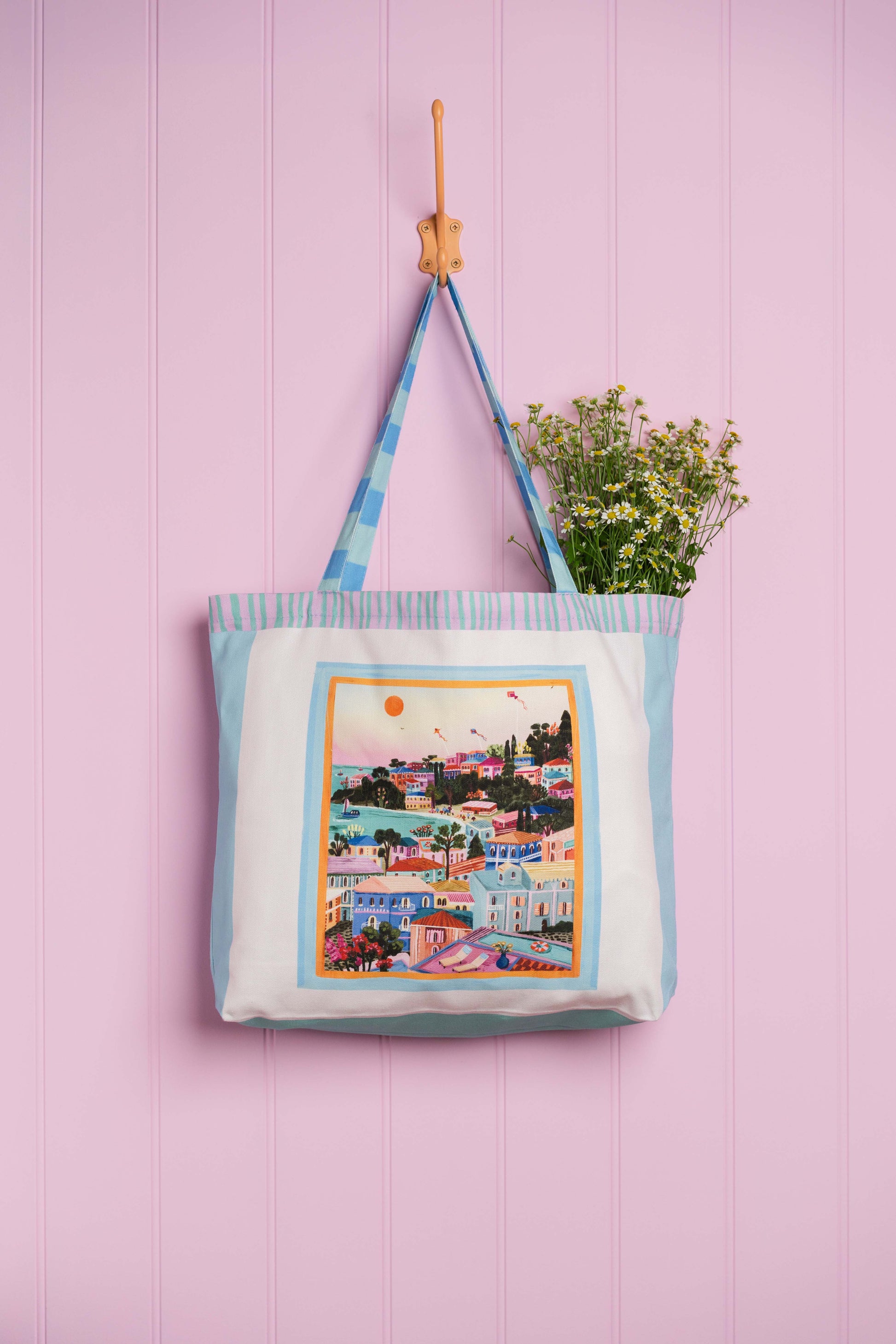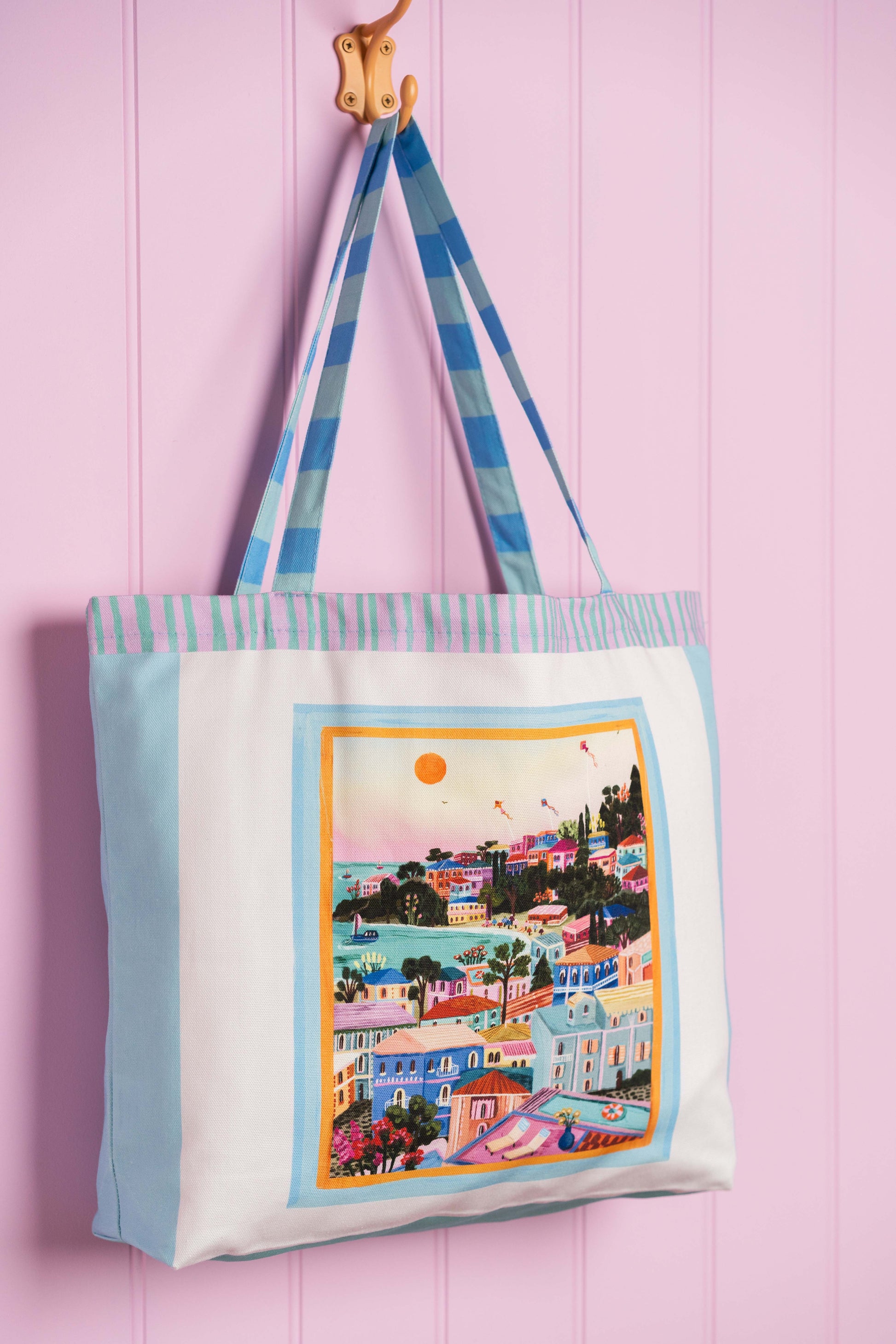 This travel inspired accessory captures the beauty of a greek island summer. Perfect for your everyday adventures, whether that's to the beach, market or just out and about running errands. Designed to be a bold statement whilst being practical to chuck in your summer essentials with ease.