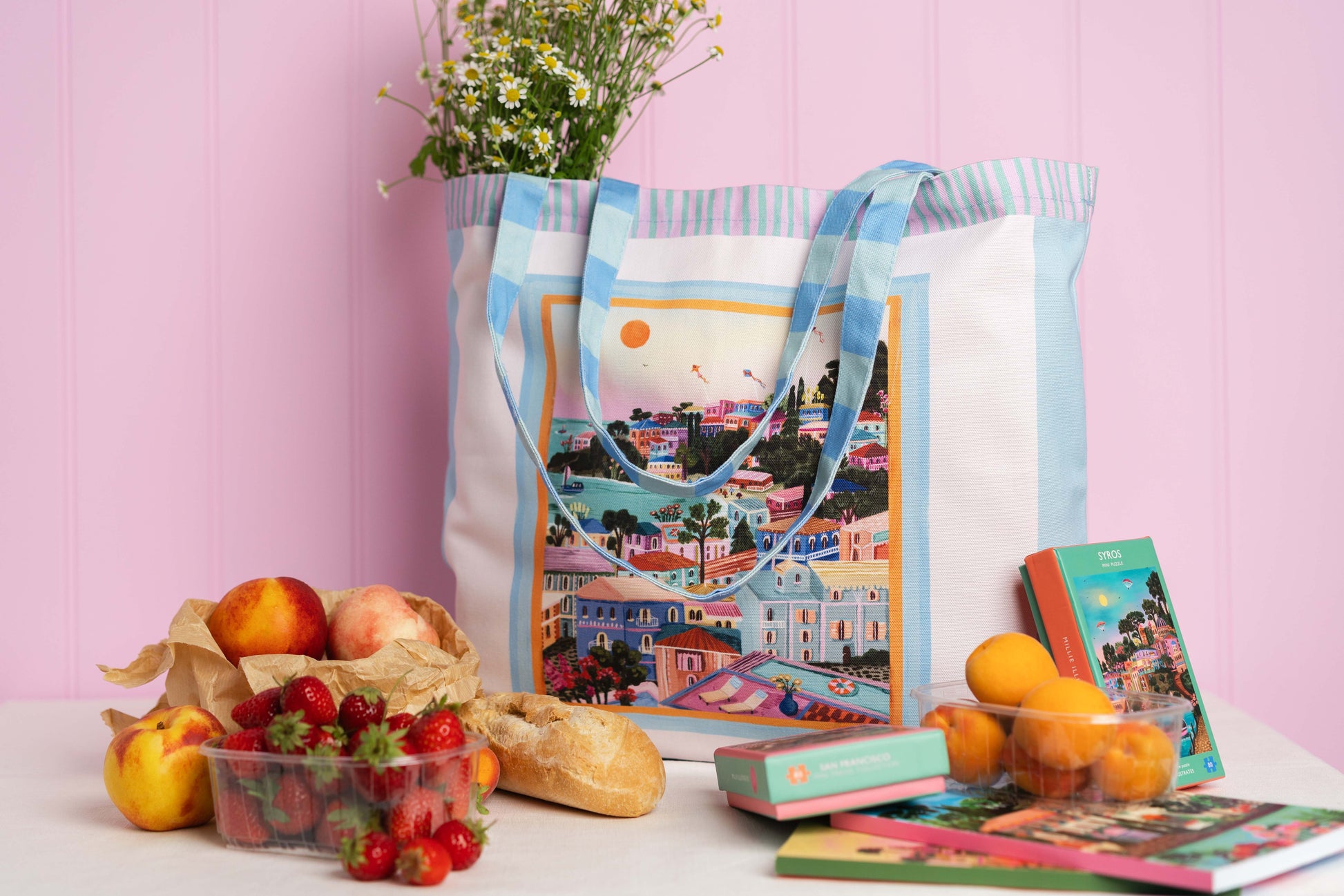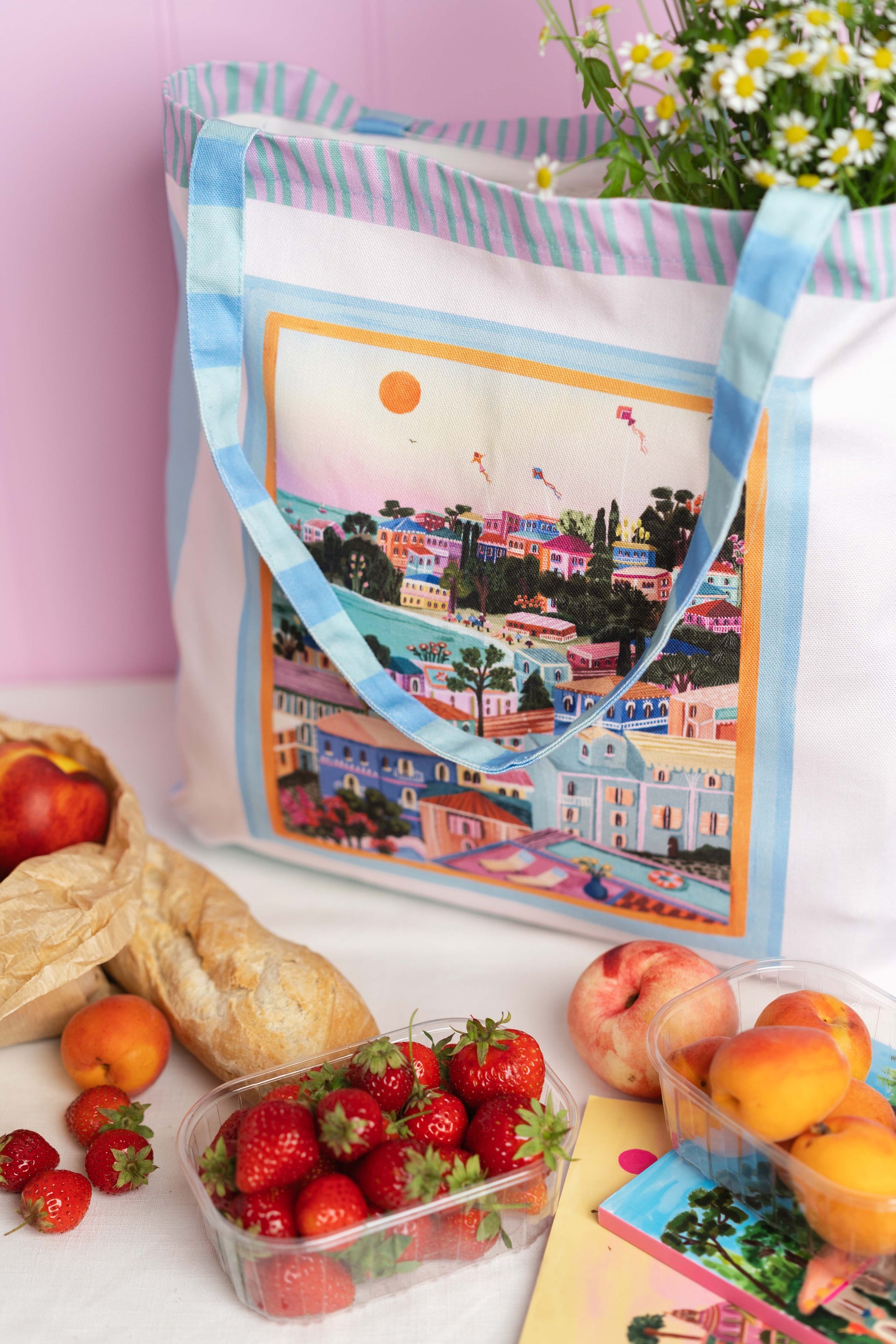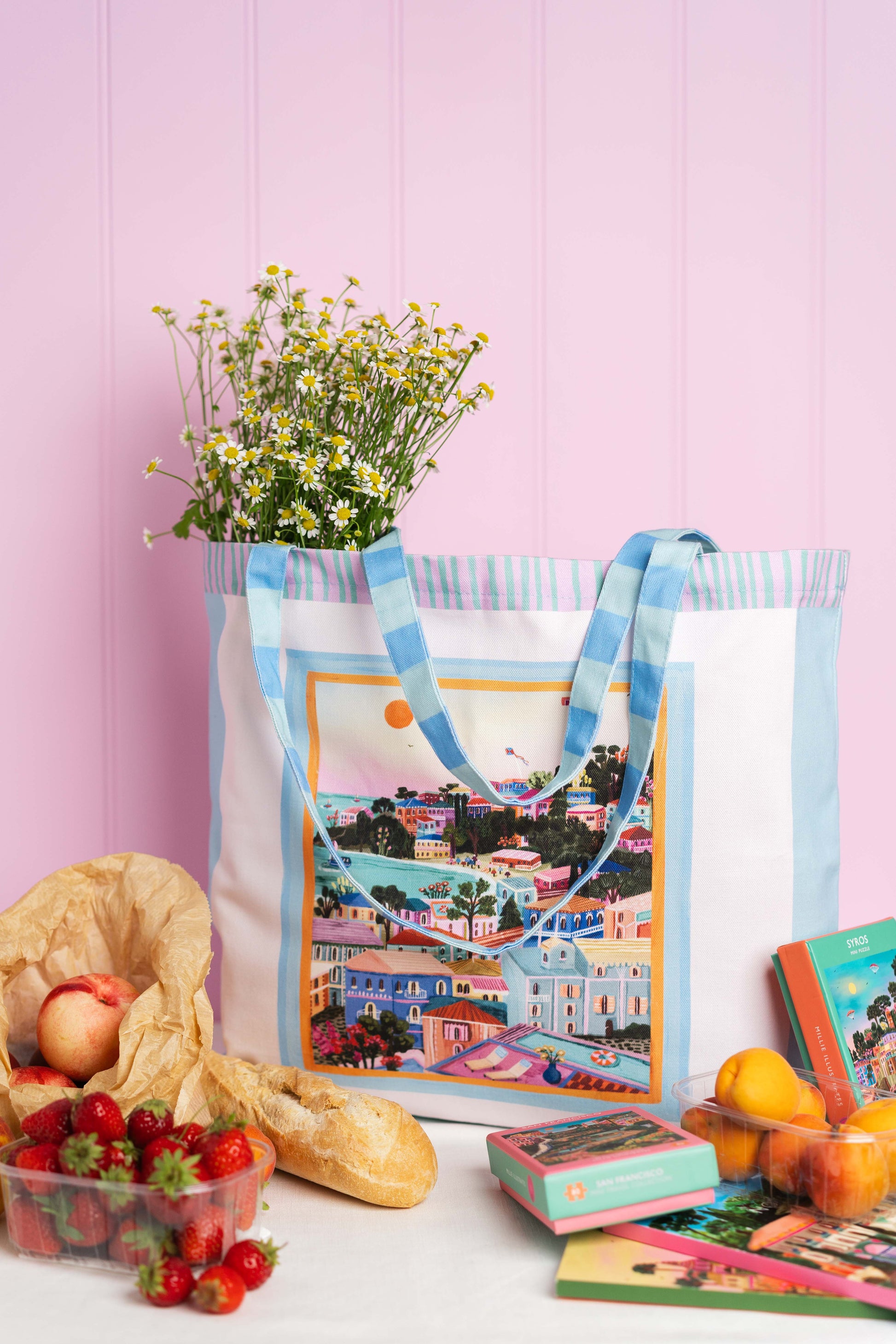 This travel inspired accessory captures the beauty of a greek island summer. Perfect for your everyday adventures, whether that's to the beach, market or just out and about running errands. Designed to be a bold statement whilst being practical to chuck in your summer essentials with ease.