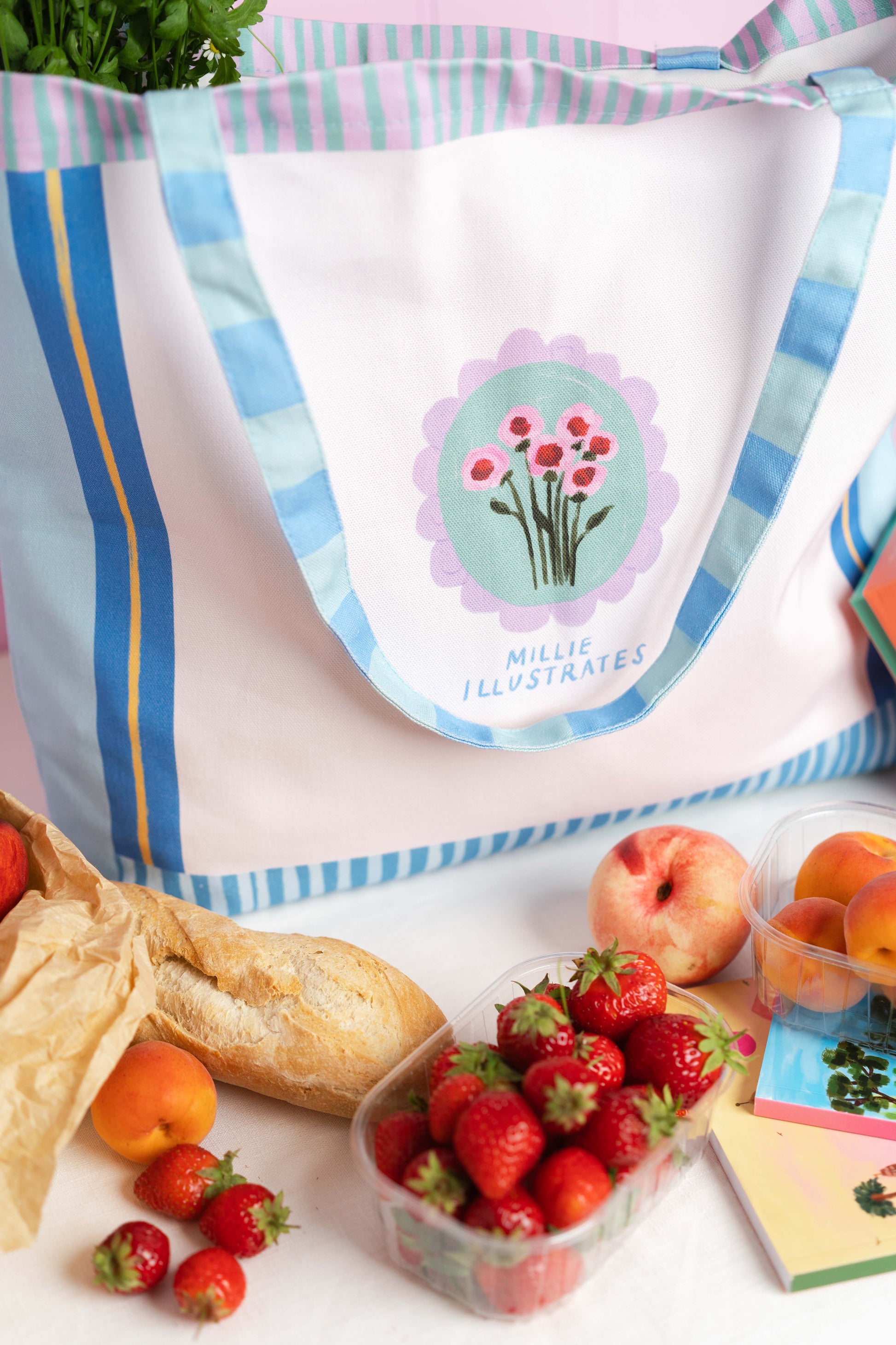 Millie illustrates logo on back of tote